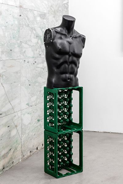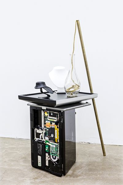 Computer screens, miniature neck mannequins, glass bottle, brass rod and gold lame rope
