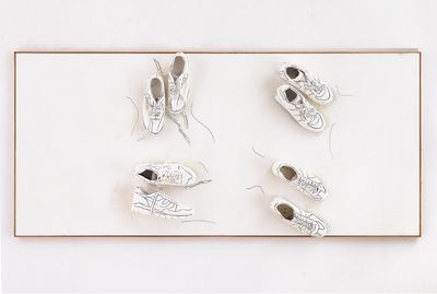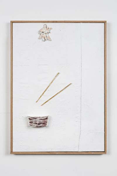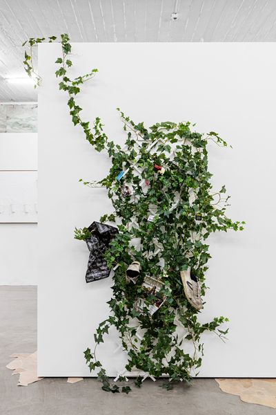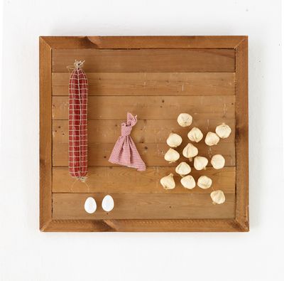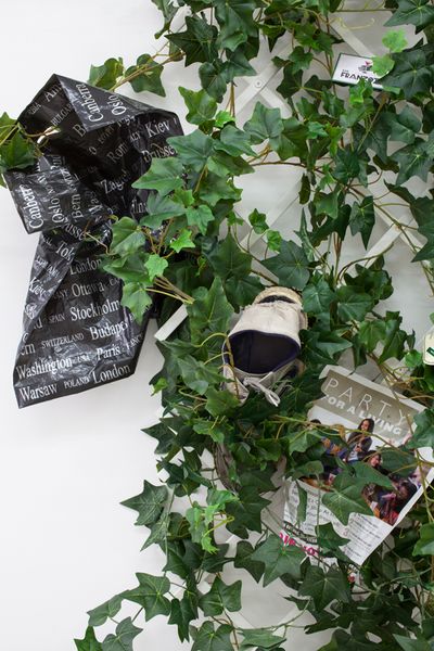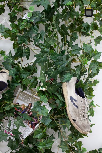 Artisanal vine, Tretorn shoes, ripped newspaper articles, rolling paper, bottle label Rotkepchen, speedometer, plastic bag, button envelope, keychain, matchbox