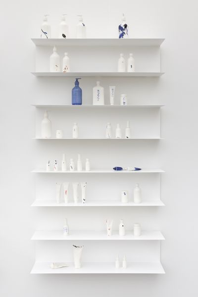 117 ceramics made of vintage porcelain from Latvia, two framed inkjet prints with acrylic paint and metal shelves,