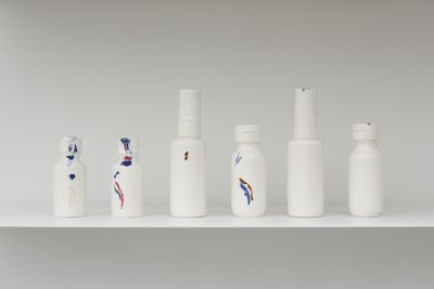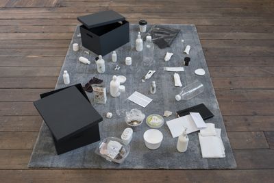 Porcelain, various material including: fabric, plastic, paper, tin foil, notebook, sea shels, sand, cosmetic box, plastic bottle