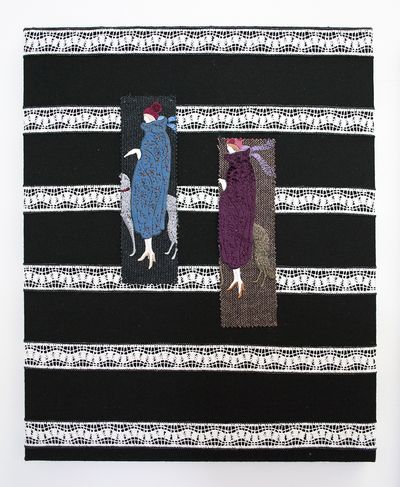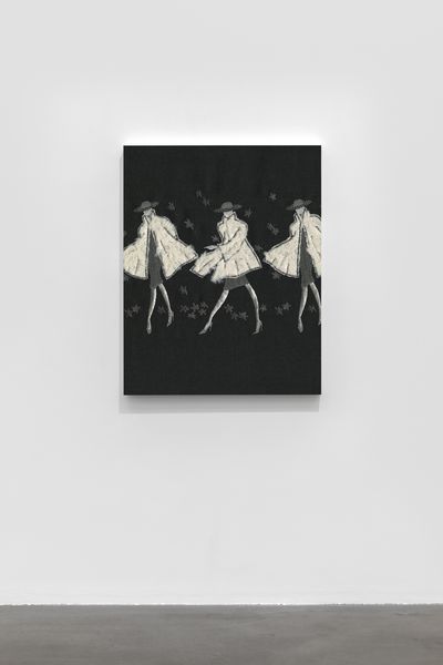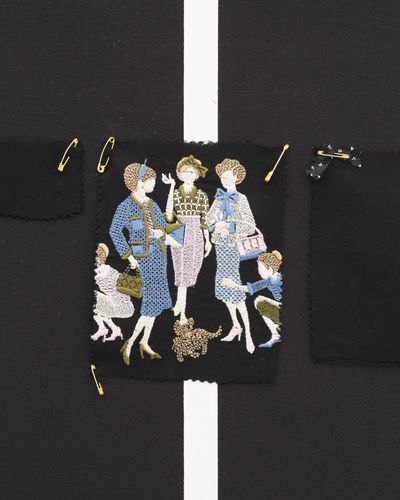 Tobias Kaspar, Untitled (NFS28- Blue and Violet Winter Coat with Greyhound Dogs, on Black Background with White Embroidery Stripes), 2018