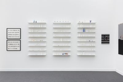 117 ceramics made of vintage porcelain from Latvia, two framed inkjet prints with acrylic paint and metal shelves,